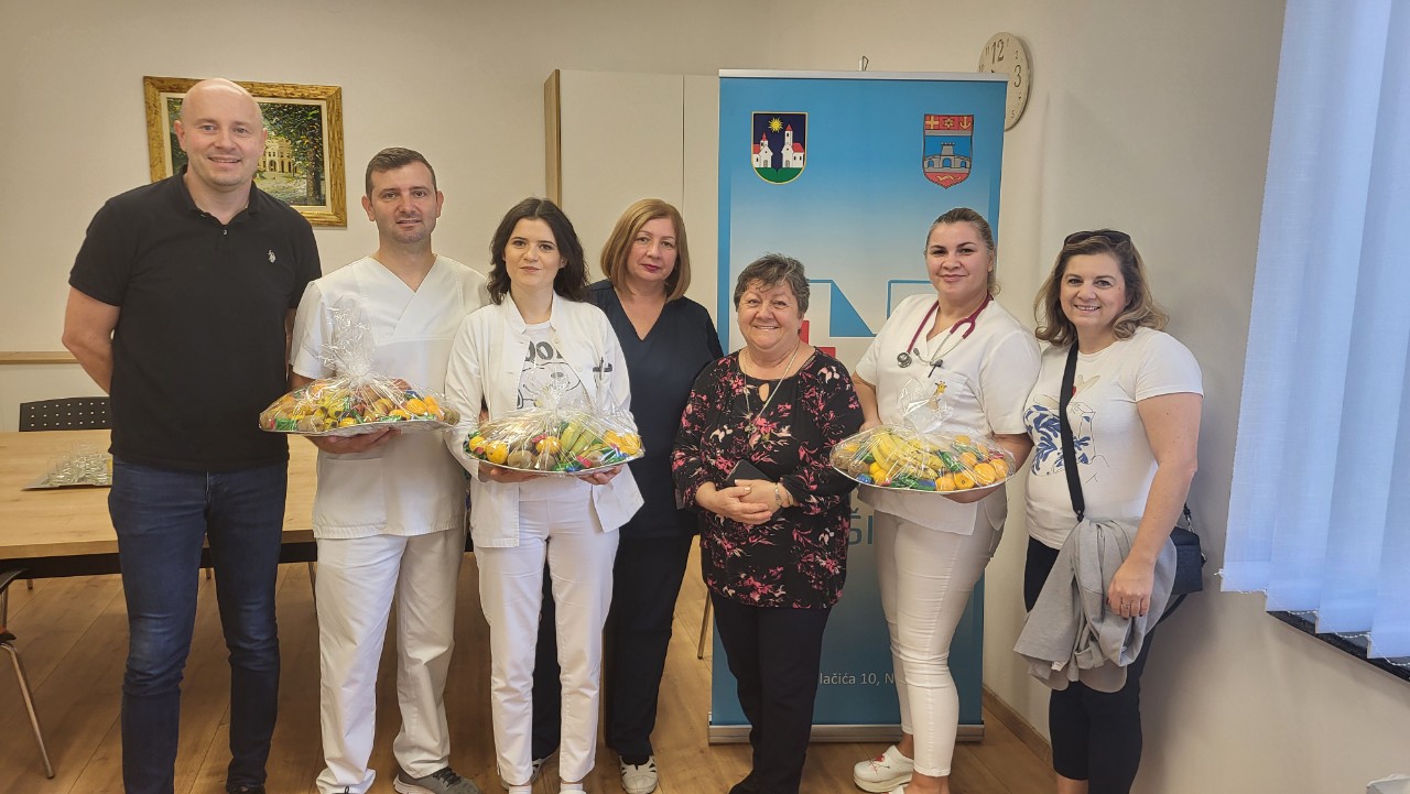 Povodom obilježavanja Dječjeg tjedna članice DND-a Našice na čelu s predsjednicom Brankom Hajek posjetili su danas Ured ravnatelja Opće Županijske bolnice Našice. Tradicionalno su stigli s voćem i slatkišima namijenjenim malim pacijentima koji se nalaze na Odjelu pedijatrije, kako bi im boravak u bolnici učinili malo ljepšim. Na posjetu i darovima zahvalili su im ravnatelj bolnice Dino Vida, doktorica Gabrijela Rendulić Wolf, specijalist pedijatrije, v.d. rukovoditelj, pomoćnica ravnatelja za sestrinstvo Zvjezdana Gvozdanović i zamjenik glavne sestre Odjela pedijatrije Marko Buha.