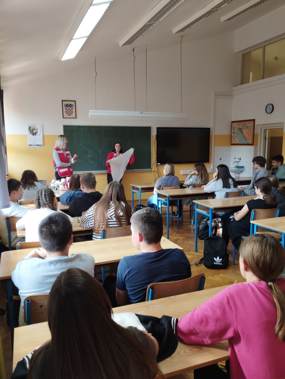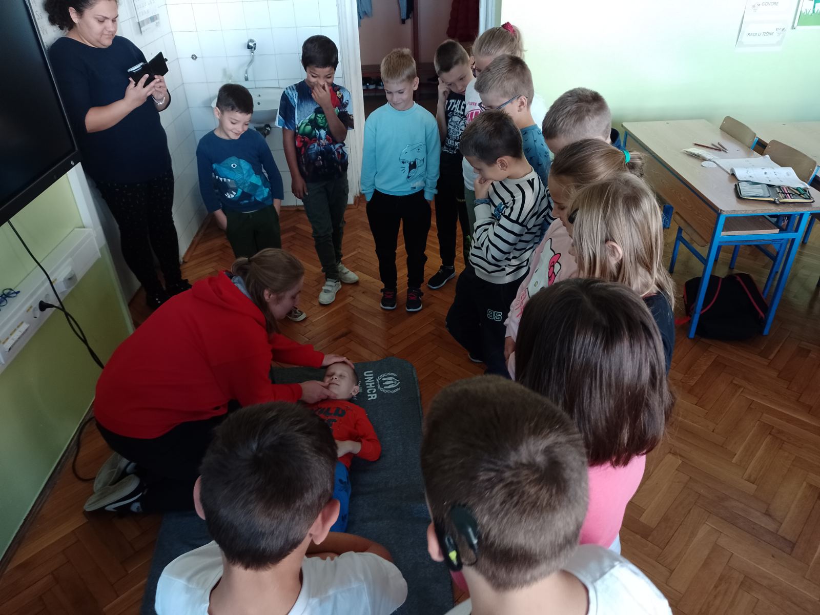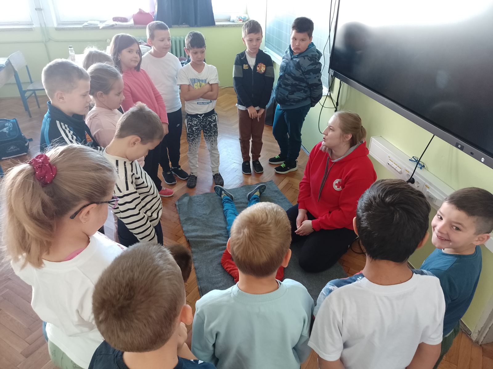 Kroz radionicu prve pomoći djeca su upoznata kako prepoznati nekoga kome je potrebno pružiti pomoć te kako pružiti potrebnu pomoć. Radionice su održane u Osnovnoj školi Hinka Juhna u Podgoraču te područnim školama u Stipanovcima, Poganovcima i Razbojištu. U radionicama je ukupno sudjelovalo stotinjak učenika 8. razreda te učenici od 1. do 4. razreda.