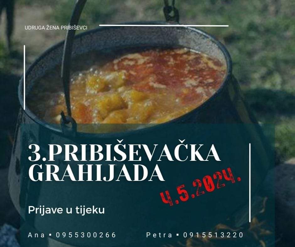 Udruga žena Pribiševci danas organizira 3.Grahijadu u Pribiševcima. Počet će u 16 sati u dvorištu društvenog doma. Kotizacija po ekipi je 15 eura, a organizatori su za sve sudionike pripremili grah, suhomesnate proizvode, vodu, kruh, zdjelice za hranu, stol i klupe te bogate nagrade za najšarmantniju i najveseliju ekipu.