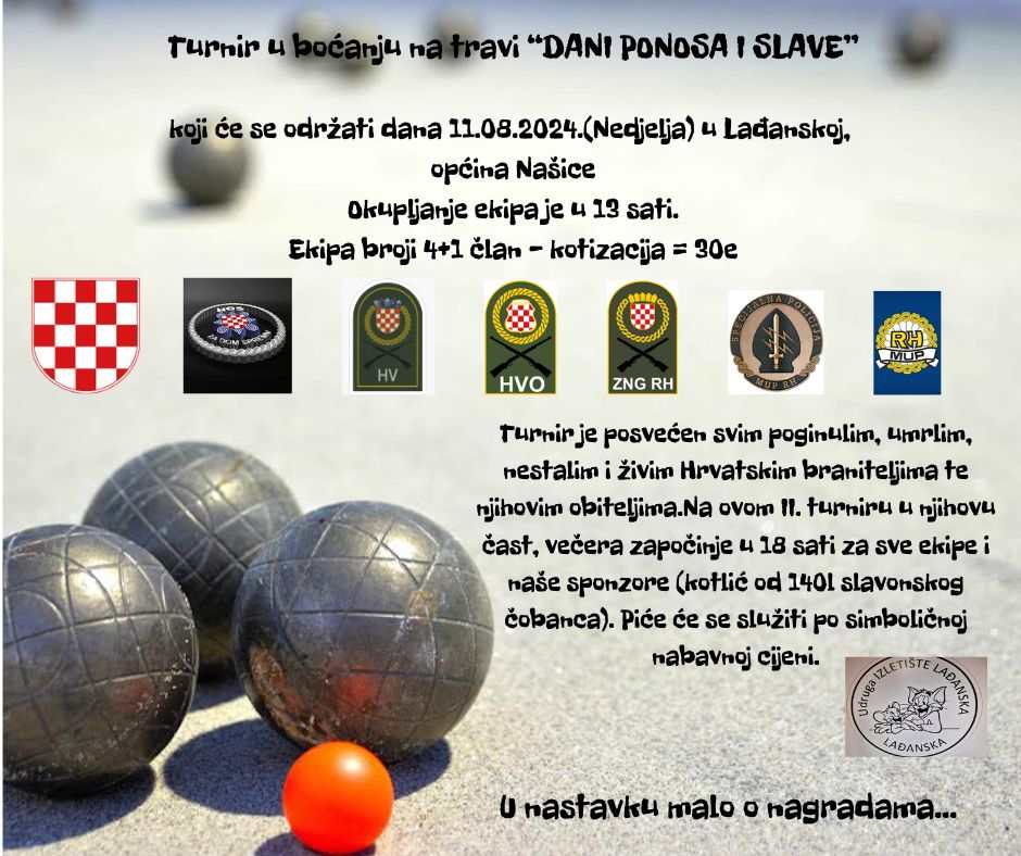 Turnir u boćanju na travi “Dani ponosa i slave” bit će održan 11. kolovoza u Lađanskoj. Svi su pozvani!