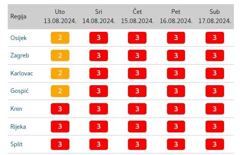 Lokalno, na kopnu u osječkoj, zagrebačkoj, karlovačkoj i gospićkoj regiji mogući su izraženiji pljuskovi s grmljavinom i olujnim udarima vjetra, dok je u priobalju ovakvo vrijeme moguće u riječkoj regiji.