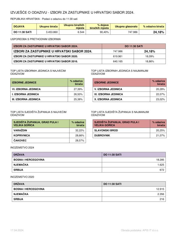 Državno izborno povjerenstvo izvijestilo je da je na izbore za 11. saziv Hrvatskoga sabora danas do 11:30 sati izašlo znatno više birača, negoli prije četiri godine. Naime, kako je DIP objavio u podne – izašlo je gotovo 750 tisuća ili 24, 18 posto birača.