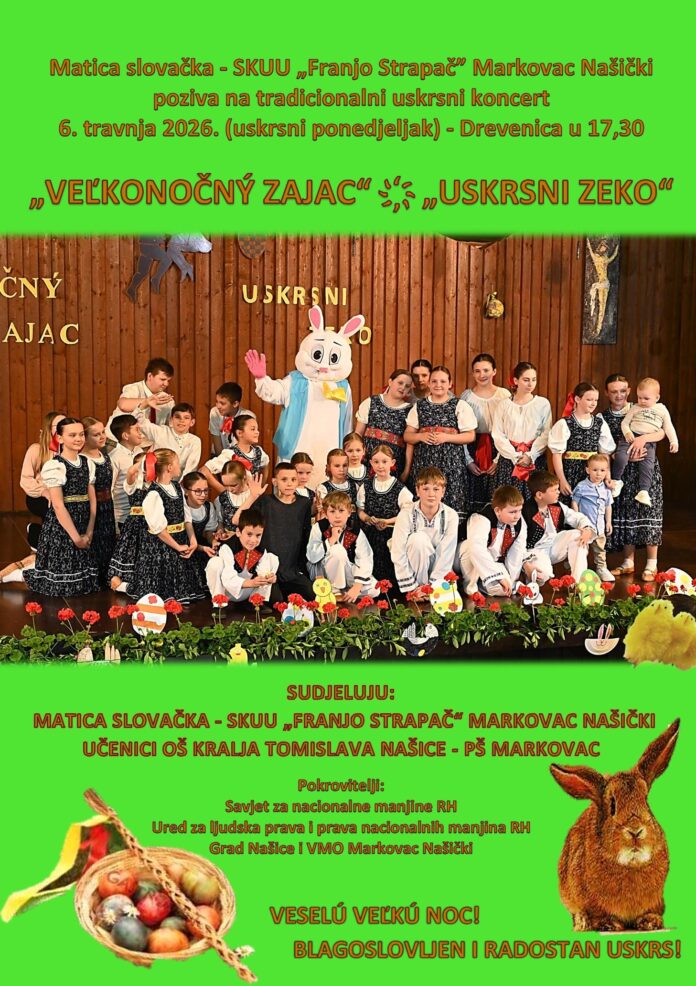Slovačka kulturno-umjetnička udruga “Franjo Strapač” Matica slovačka Markovac svojoj publici na Uskrsni ponedjeljak priprema tradicionalni koncert “Uskrsni zeko”. Počet će u 17:30 u markovačkoj Drevenjici. Uz domaćine – markovačke folkloraše i članice Matice, nastupit će i učenici Osnovne škole kralja Tomislava Područne škole Markovac Našički.