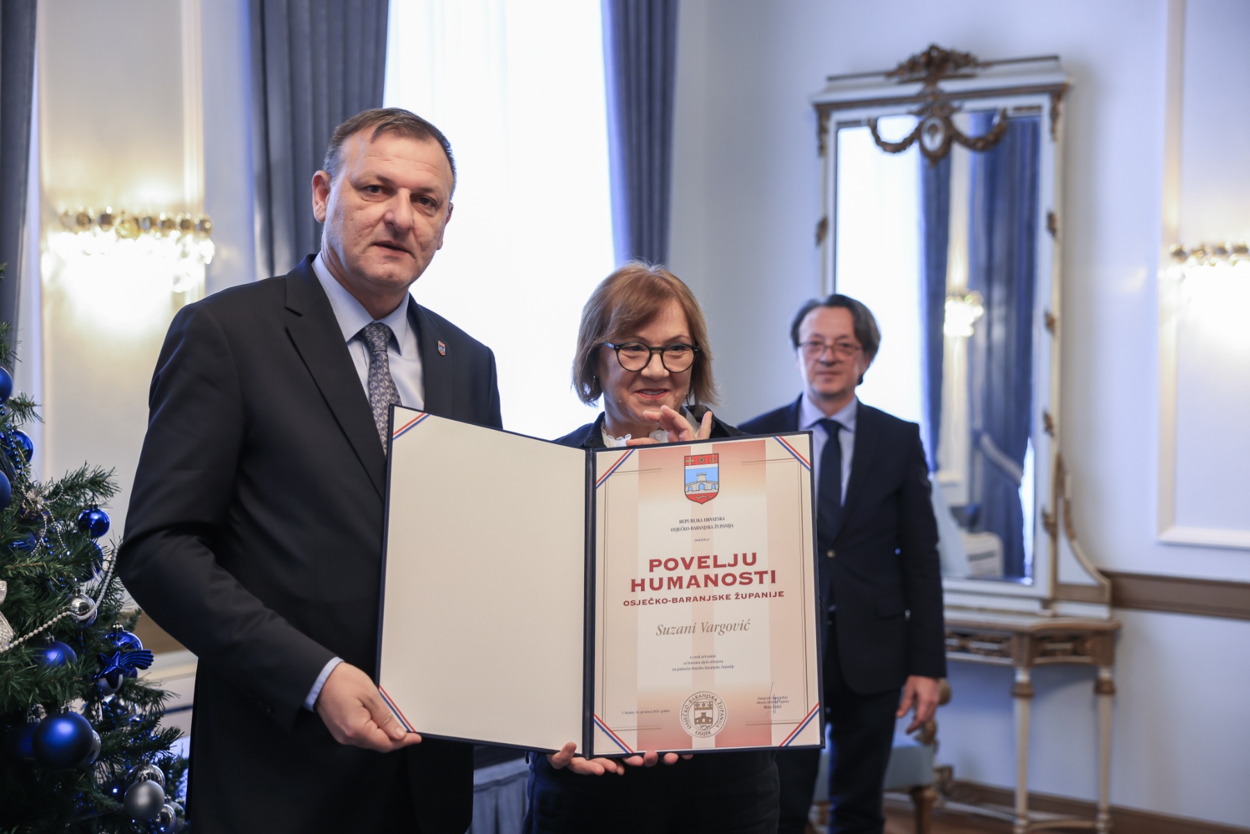 Svečano uručenje Povelje humanosti OBŽ za 2024. godinu upriličeno je danas u sjedištu Županije u Osijeku, a uz obnašatelja dužnosti župana Matu Lukića, svečanosti su nazočili zamjenik župana Josip Miletić, saborska zastupnica Nataša Tramišak, pročelnice i pročelnici upravnih odjela, kao i suradnici, rodbina i prijatelji dobitnika. Uz iskrene čestitke, župan je Povelju humanosti za brigu i skrb o djeci bez roditelja, napuštenoj i drugoj ugroženoj djeci uručio Suzani Vargović, predsjednici Udruge Breza koja je jedina organizacija civilnog društva u Hrvatskoj koja provodi izvaninstitucijsku socijalnu uslugu stanovanja za djecu i mlade te Danieli Taslidžić Herman za skrb o bolesnima, tjelesno i društveno povrijeđenima i svima kojima je potrebna pomoć drugog čovjeka, odnosno za višegodišnji rad s invalidnom osobom, pomaganje djeci u SOS dječjem selu i stvaranje preventivnih programa i predstava kroz rad u Gradskom kazalištu u Belom Manastiru.