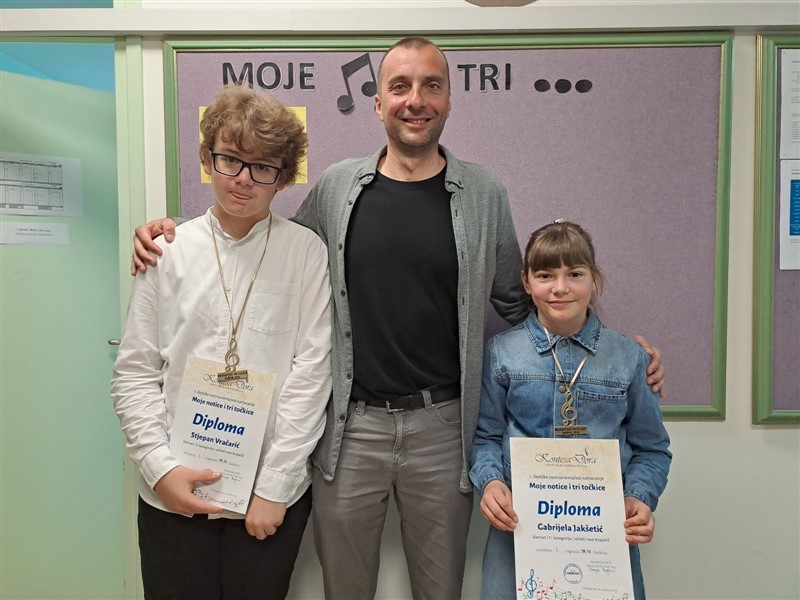 U Osnovnoj glazbenoj školi Kontesa Dora jučer je održano 7. školsko instrumentalno natjecanje Moje notice i tri točkice. U osam disciplina (klavir, harmonika, klarinet, violina, gitara, tambure, duo i komorni sastav od 6 do 9 članova) natjecalo se 44 učenika. Učenica Gabrijela Jakšetić u klasi učitelja Ivana Krajačića u disciplini klarinet, apsolutna je pobjednica natjecanja sa osvojenih 98,13 bodova i dobivenom Zlatnom plaketom. Gabrijelu je na klaviru pratila učiteljica Vedrana Matić. Učenici koji su također osvojili Zlatnu plaketu, prvu nagradu sa najvećim brojem bodova u svojim disciplinama su: Antun Makov, disciplina harmonika, u 2. kategoriji osvojio je 91 bod u klasi učitelja Novice Todića; Patrik Mandić, disciplina klavir, u 1. kategoriji osvojio je 96,38 bodova u klasi učiteljice Sanje Vazdar; Ana Čerepinko, disciplina gitara, u 4. kategoriji osvojila je 97,88 bodova u klasi učitelja Maria Huja;