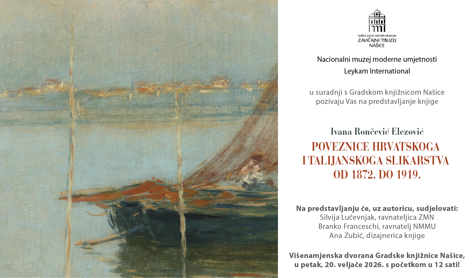 Zavičajni muzej Našice, Nacionalni muzej moderne umjetnosti i Leykam International, u suradnji s našičkom knjižnicom, organiziraju predstavljanje knjige dr. sc. Ivane Rončević Elezović. Naziv knjige je „Poveznice hrvatskoga i talijanskoga slikarstva od 1872. do 1919.”. Predstavljanje će biti održano u petak, 20. veljače u Gradskoj knjižnice Našice. Početak je u 12 sati.
