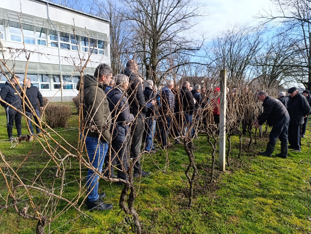Udruga voćara i vinogradara Našice, danas je u voćnjaku i vinogradu Srednje škole Isidora Kršnjavoga organizirala pokaznu radionicu rezidbe voćaka i vinova loze.