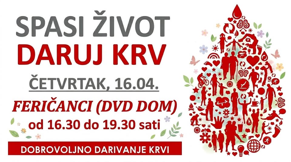 Akcija dobrovoljnog darivanja krvi sutra (četvrtak) će biti održana u Domu DVD-a u Feričancima od 16:30 do 19:30. Svi ste pozvani!