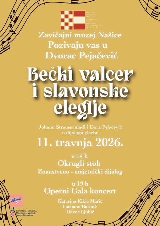 U Dvorani Dvorca Pejačević sutra (subota) će, u sklopu Projektne koncepcije hrvatsko-austrijskih veza i baštine na temu “Bečki valcer i slavonske elegije” – Johann Strauss mlađi i Dora Pejačević u dijalogu glazbe, biti održani okrugli stol i operni gala koncert.