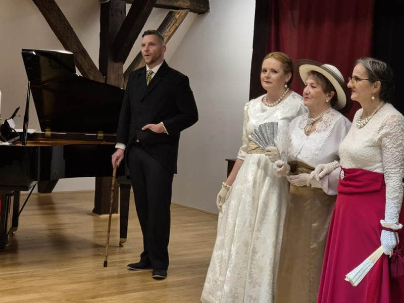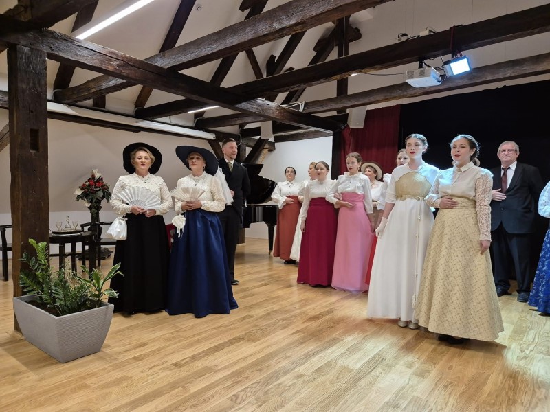 U programu su sudjelovali dječja i veteranska folklorna skupina te A sastav folklorne sekcije Društva, a ovoga puta narodne nošnje zamijenili su prekrasnim haljinama iz nekih prošlih vremena. „Miruj, miruj srce moje”, „Na te mislim” i „Za jedan časak radosti” samo su neke od svevremenskih pjesama koje je publika imala priliku poslušati na jučerašnjem koncertu. A kako bi što više dočarali ugođaj u kojemu su se nekada pjevale ove pjesme i plesali plesovi uz zvuk klavira i violine, članovi „Lisinskog” prostor višenamjenske dvorane u Dvorcu Pejačević vratili su u prošla vremena i u njega unijeli opušteni ambijent u kojemu morate zastati i prepustiti se glazbi.