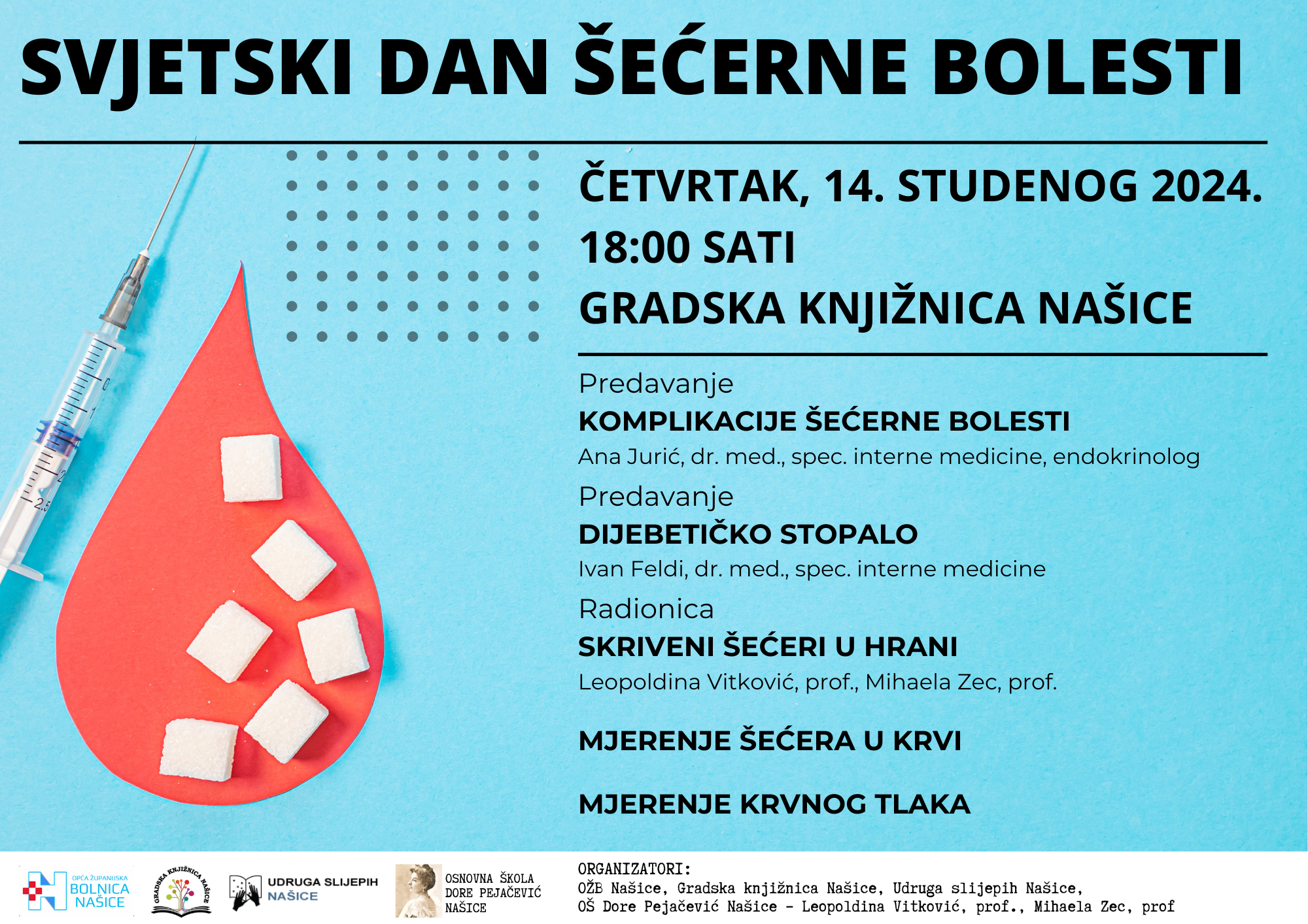 U organizaciji Opće županijske bolnice Našice, Gradske knjižnice, Udruge slijepih i Osnovne škole Dore Pejačević, u multimedijalnoj dvorani Gradske knjižnice Našice u četvrtak 14. studenog, bit će održano zanimljivo predavanje povodom Svjetskog dana šećerne bolesti.