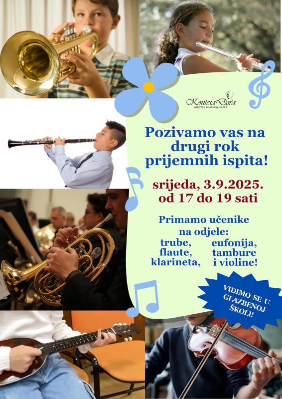 Osnovna glazbena škola Kontesa Dora Našice poziva na drugi prijemni rok za 1. razred glazbene škole. Prijemni ispit bit će sutra (3.rujna) od 17 do 19 sati.