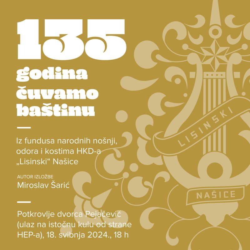 U subotu 18. svibnja bit će otvorenje izložbe “135 godina čuvamo baštinu”- iz fundusa narodnih nošnji, odora i kostima HKD-a “Lisinski” Našice. Izložba će biti otvorena, u 18 sati, u potkrovlju dvorca Pejačević s pristupom iz istočne kule (strana od HEP-a).