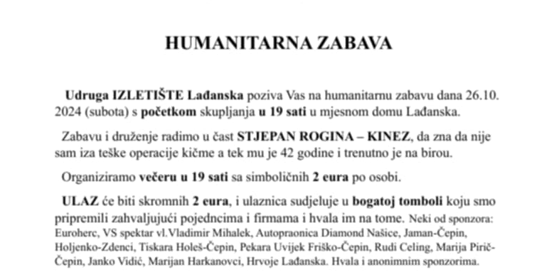 Udruga „Izletište” Lađanska organizira humanitarnu zabavu koja će biti održana danas u 19 sati u društvenom domu u Lađanskoj. Ulaz je 2 eura koliko je i cijena večere, a sva prikupljena sredstva bit će donirana Stjepanu Rogini-Kinezu za liječenje nakon teške operacije. Za sve posjetitelje osigurana je tombola s bogatim nagradama, a u glazbenom dijelu sudjelovat će Zorko band & Đuka Klaban.