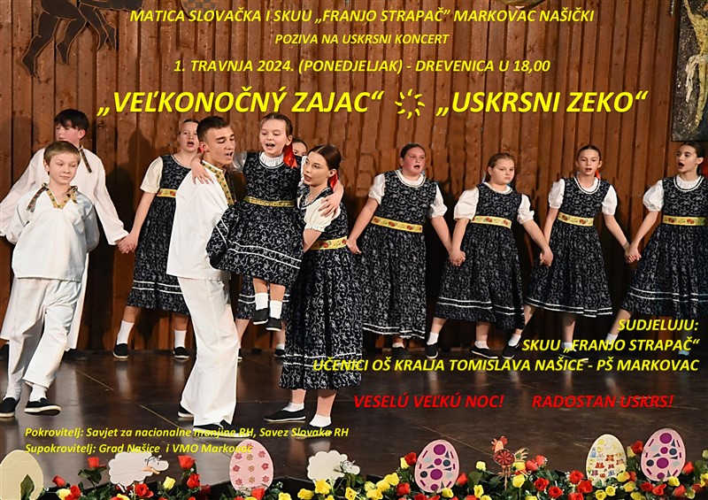 Matica slovačka i Slovačka kulturno-umjetnička udruga „Franjo Strapač” na Uskrsni ponedjeljak, 1. travnja, u Drevenici organiziraju koncert „Uskrsni zeko”. Sudjelovat će Slovačko-kulturno umjetnička udruga „Franjo Strapač” i učenici Osnovne škole kralja Tomislava Našice, Područne škole Markovac. Koncert će početi u 18 sati. Pokrovitelji su Savjet za nacionalne manjine i Savez Slovaka Republike Hrvatske, a supokrovitelji Grad Našice i Vijeće Mjesnog odbora Markovac.