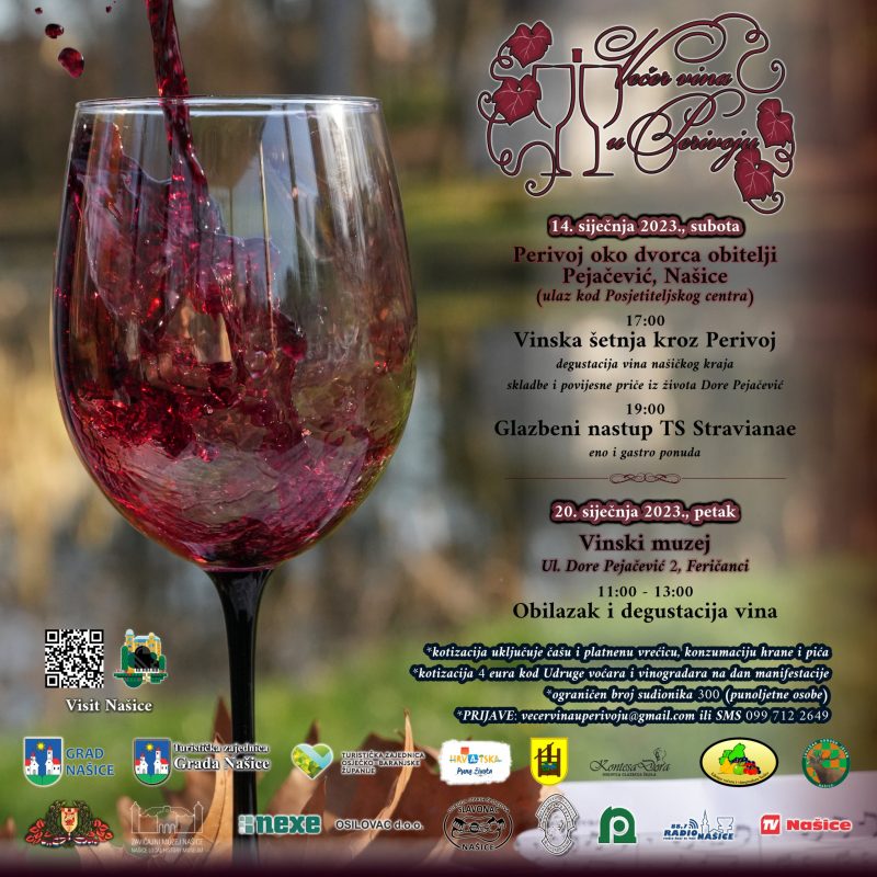 Grad Našice i Turistička zajednica Grada u subotu ( 14. siječnja) organiziraju “Večer vina u Perivoju”. Počet će u 17 sati.